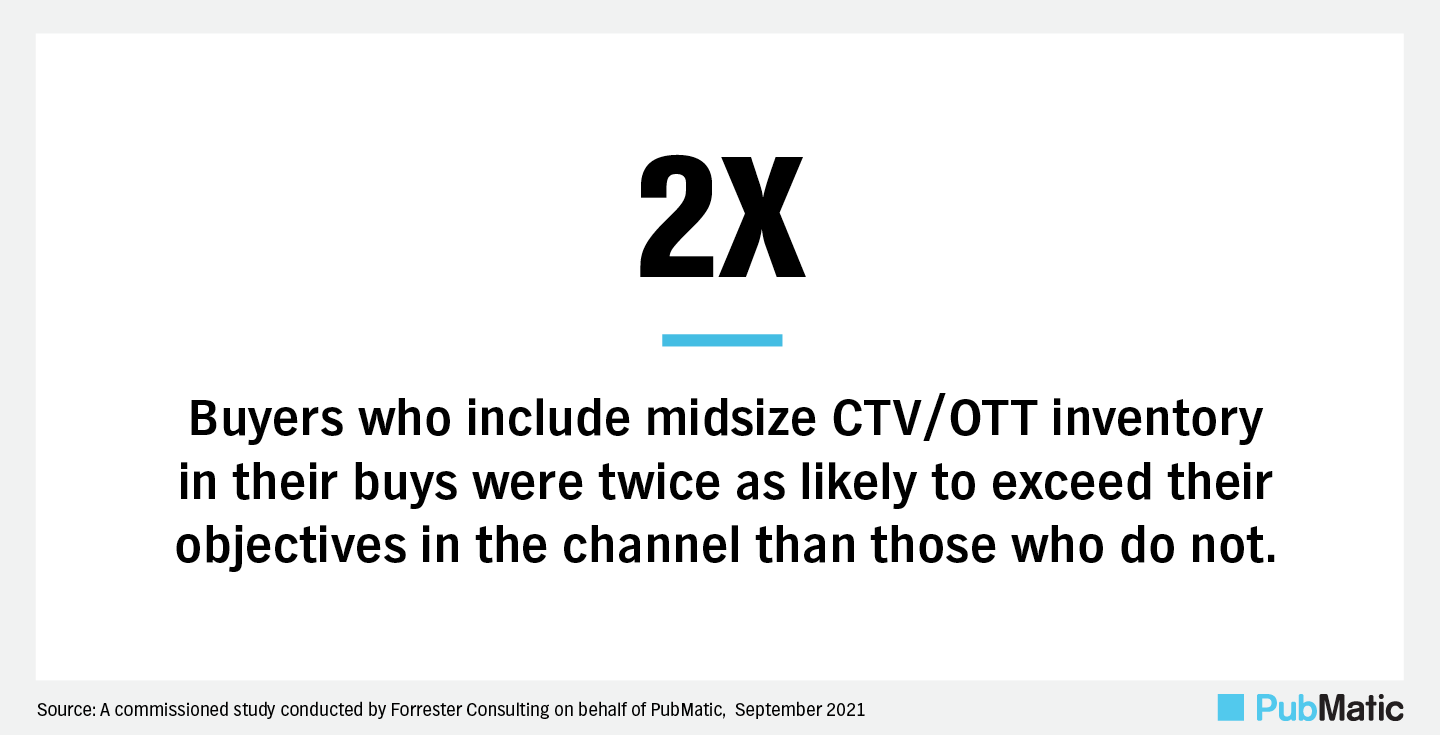 But in so doing they are missing an opportunity to reach viewers across an increasingly fragmented landscape of channels, formats and devices. They’re also leaving money on the table. That’s because buyers who include midsize CTV/OTT in their strategies are twice as likely to have exceeded their campaign objectives.