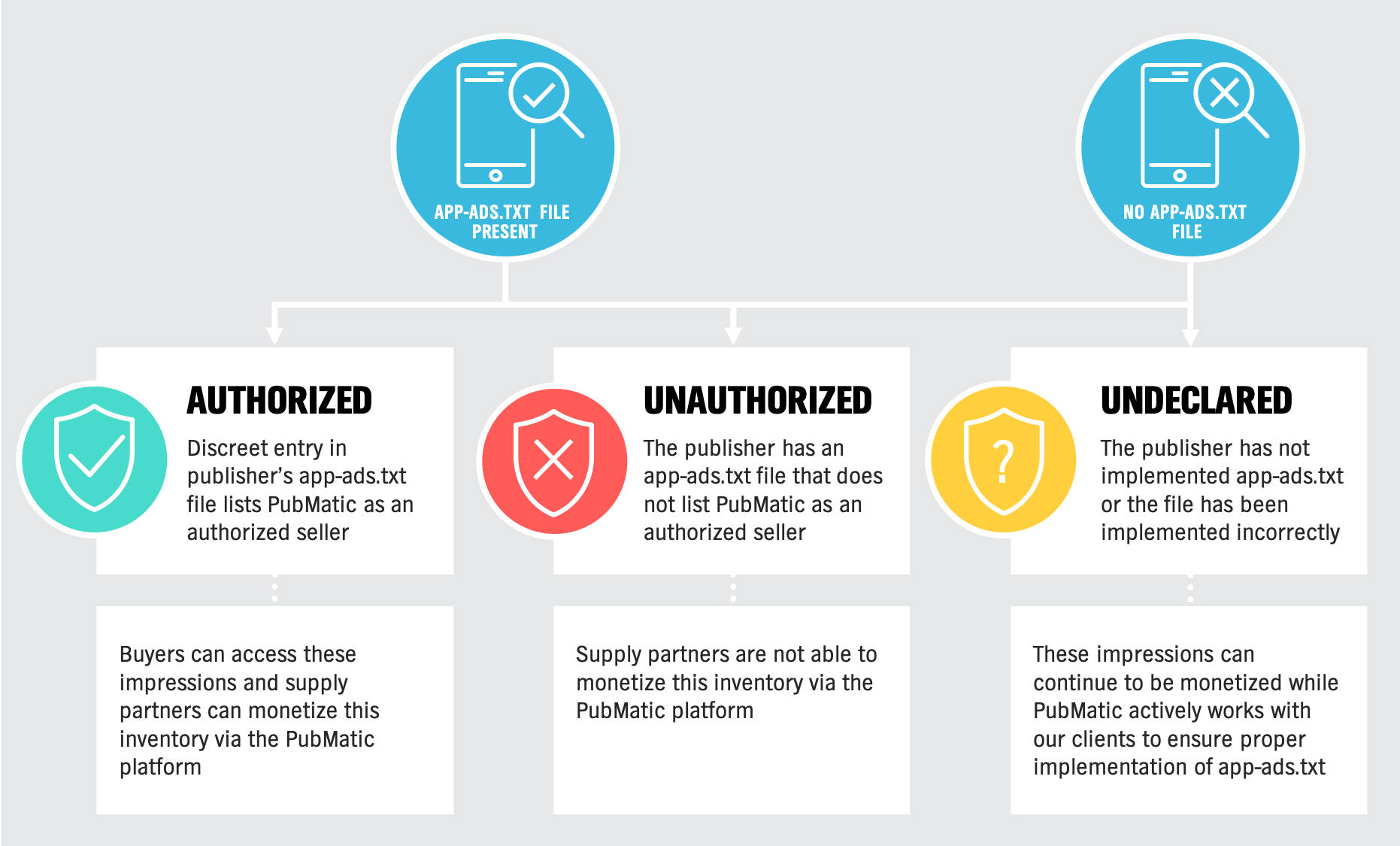 Brand advertisers can be more confident accessing programmatic in-app inventory via PubMatic, knowing that their ads will not appear on fraudulent sites. In addition to supporting app inventory with our Fraud Free Program, enforcing app-ads.txt allows PubMatic to ensure greater levels of brand safety since unauthorized inventory will not be accessible via the PubMatic platform.
