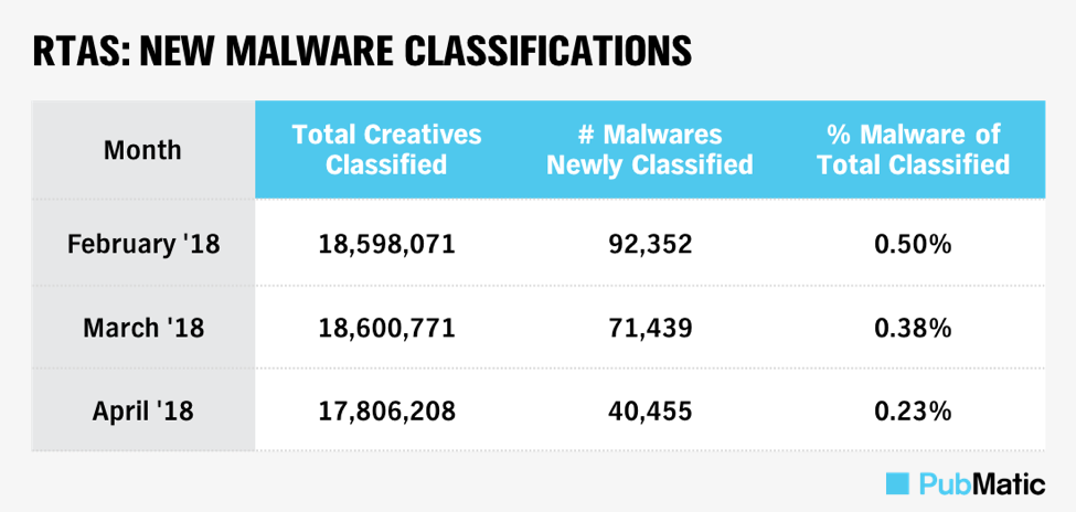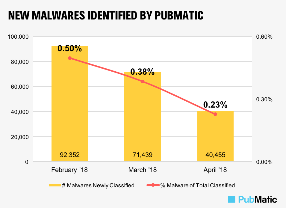 PubMatic scanned roughly 18 million creatives from February through April 2018, however, the number of new malicious creatives has more than halved from February (92,352) to April (40,455).
