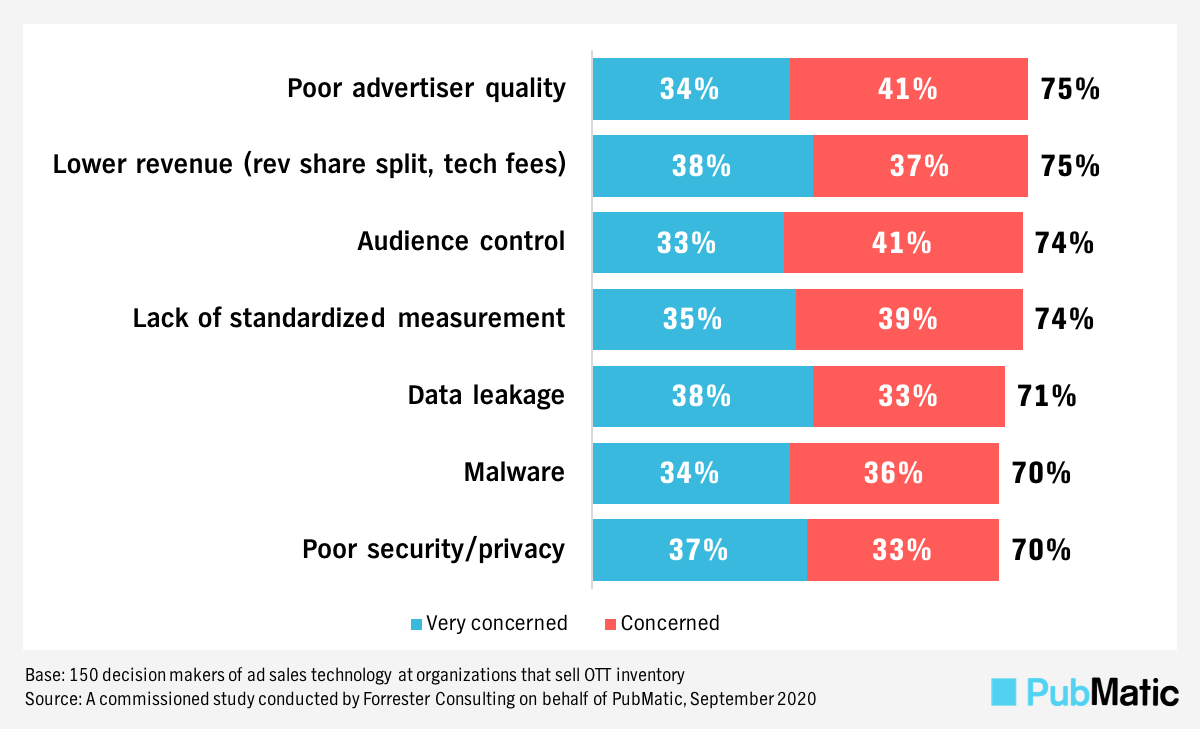 Concerns over inventory control can hinder programmatic adoption; publishers continue to struggle with control over to whom it is sold, control over the audience experience and security safeguards. Nearly 75% of respondents are concerned about lower quality advertisers depressing valuable inventory. Nearly the same percentage of publishers are concerned about a lack of standardized measurement and audience control. Data security and privacy concerns are not far behind; roughly 70% of respondents are concerned about data leakage and poor security controls. For a successful programmatic OTT strategy, it is important to work with a seasoned, premium partner with omnichannel and infrastructure experience to empower publisher control within the ecosystem. Providing transparency into potential quality issues, viewer experience, and security risks should be table stakes.