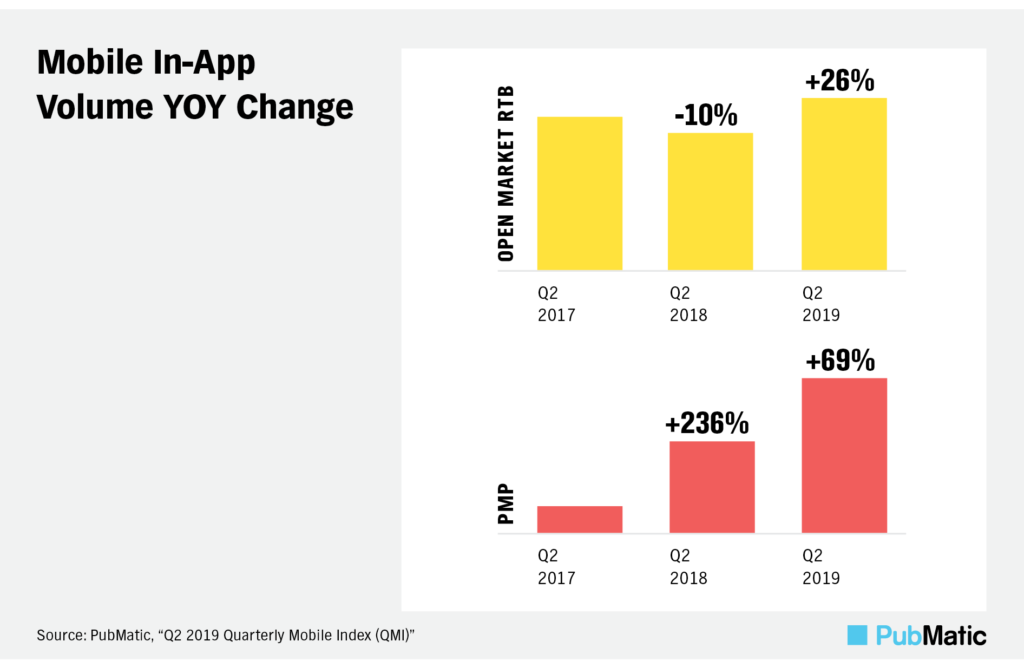 Roughly half of the global in-app ad inventory comes from the North Americas region. While this region commands the majority share, the pace in APAC is accelerating. Industry analysts expect the North American mobile programmatic media spending share, inclusive of in-app, to fall 4 percentage points by 2022 as APAC continues to expand.[1] For the first time, APAC surpassed EMEA as the second largest region for in-app ad impressions in Q2 2019; APAC now accounts for over a quarter of the global inventory. In terms of approach, we see much of the in-app inventory rapidly growing through PMPs; mobile in-app PMP volume increased by 69% in Q2 2019 year-over-year, after almost tripling the previous year. This shift is swinging inventory from the open market amid fraud concerns last year.