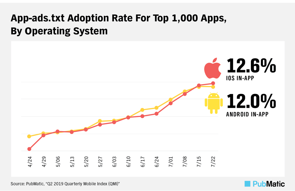 Recent efforts to combat app fraud culminated in the IAB’s release of the app-ads.txt specification this March, which facilitates better transparency for buyers within the mobile in-app environment.[1] Roughly 12% of the top 1000 industry apps published app-ads.txt files as of mid-July 2019 – an impressive growth from 0% in a matter of weeks.