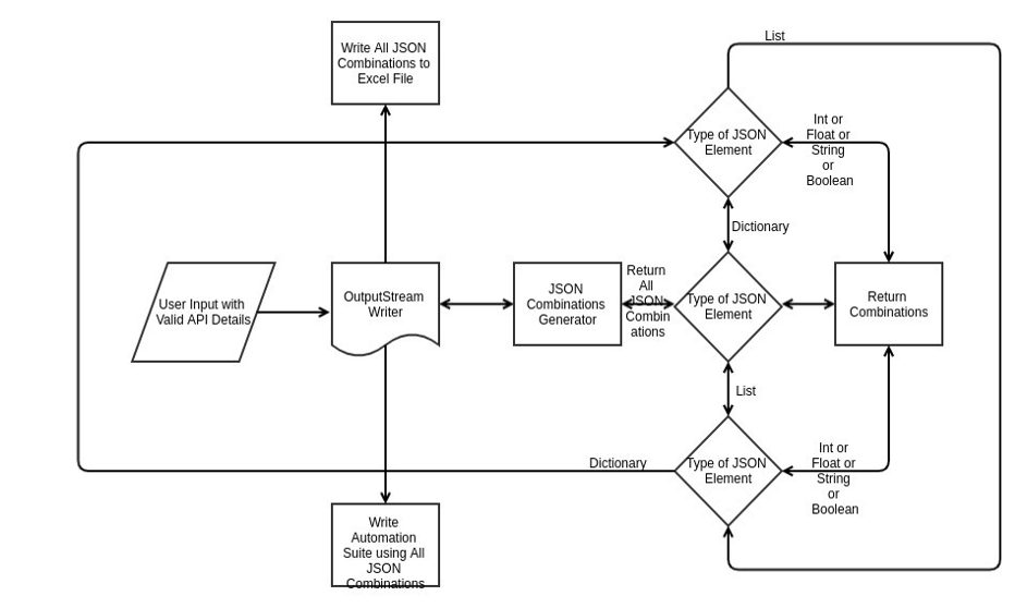 The JSON Combinations Generator is the core component of NeTBot, which takes API details as input with valid parameters. It scans through the valid API request details and generates all possible JSON combinations in a list if the request body is present in the input. It also generates a list of boolean values, which stores whether the generated JSON is Valid or Invalid. Once all the JSON combinations are generated, it returns both the lists to our OutputStream Writer to write test cases into the Excel sheet and write the ready to execute automation test suite.