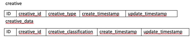 select cd.creative_id, cd.creative_classification from creative c inner join creative_data cd on c.creative_id = cd.creative_id and c.creative_type = ‘video’ order by cd.create_timestamp desc limit 100;