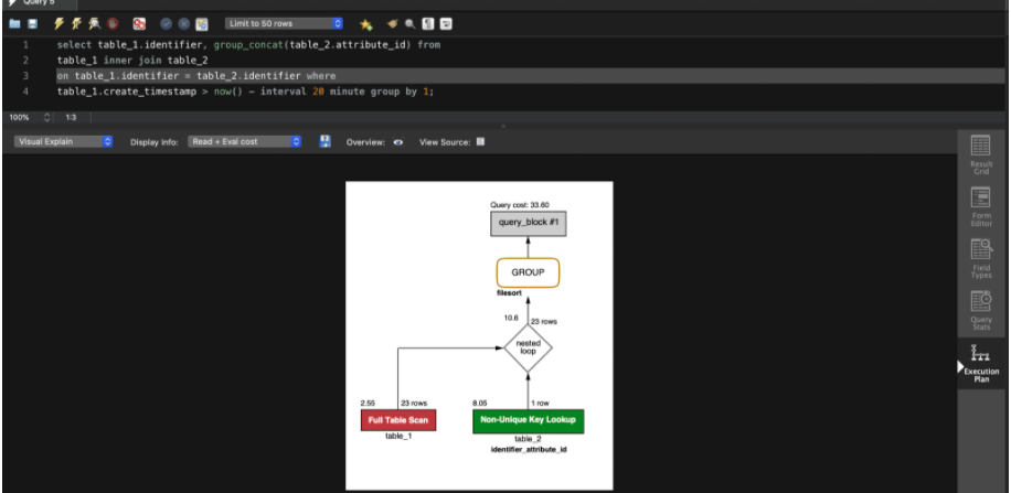 The explain command helps us understand each step in the query execution plan. A practice which we thoroughly follow is to review the explain output of every query before it goes to production, especially ones which execute on large tables. You can use the MySQL Workbench visual/tabular explain tool to view the query execution plan. Review the key (shows which index the optimizer decided to use to minimize query cost), possible_keys ,extra columns in the output.