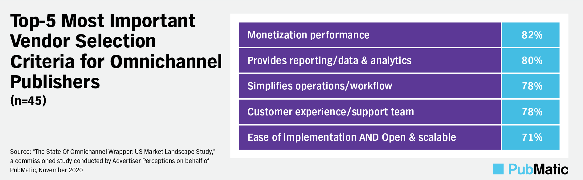 According to the study, the decision-driving criteria in choosing an omnichannel partner is the ability to truly increase overall monetization. While this is table stakes, omnichannel publishers also place importance on added criteria: reporting/data analytics, simplified workflow, customer service, ease of implementation and scalability.