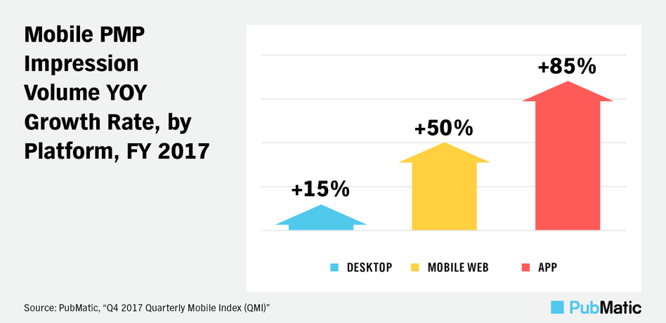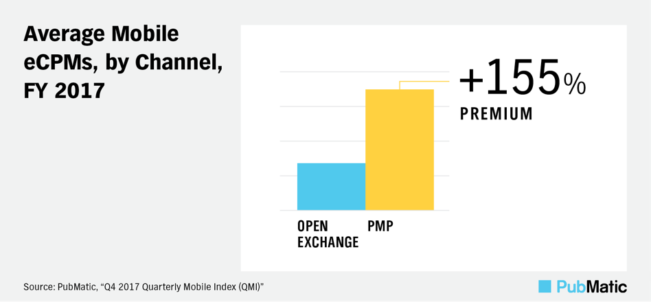 Additional controls over their inventory and partnerships with advertisers enable publishers to bank on one of the most important benefits mobile PMPs have to offer: higher eCPMs. According to PubMatic’s Q4 2017 Quarterly Mobile Index, mobile PMPs earned 155 percent higher eCPMs than the average paid for mobile open exchange impressions in 2017.