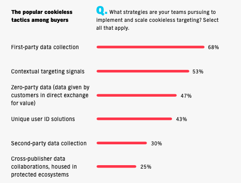 When it comes to testing, buyers are focused on the growth of first-party data (68% respondents focused here) as well as contextual (53%). But they know that the path forward will not be one-size-fits-all, and are actively exploring many approaches. Interestingly, 47% said zero-party data is the third most popular tactic among buyers.