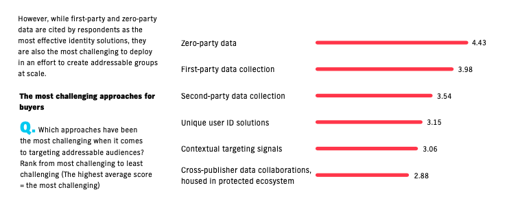 Interestingly, zero-party data is both a focus and a huge challenge for buyers. Since zero-party data could be an email address tied to explicit consent, it makes sense that this is one of the biggest focal points: that data is incredibly valuable. However, it can be difficult to obtain, unless there is a very clear and worthwhile value exchange. Additionally, zero party data will have limited scale.