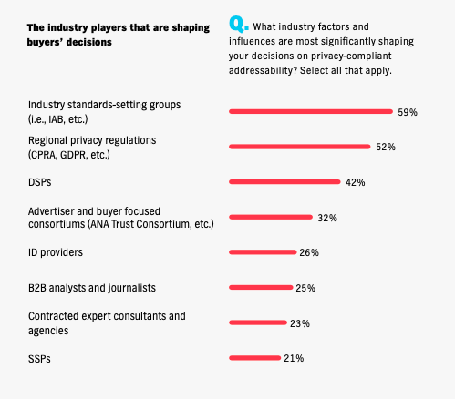 Finally, buyers are listening to a few key signals to help guide them forward. They are looking to trade groups like the IAB, as many in the industry are, to create the frameworks and technical specs necessary for standardized addressability. Many buyers rely on their demand side platforms (DSPs) to help educate them on what to do, as well as their peers in the industry.