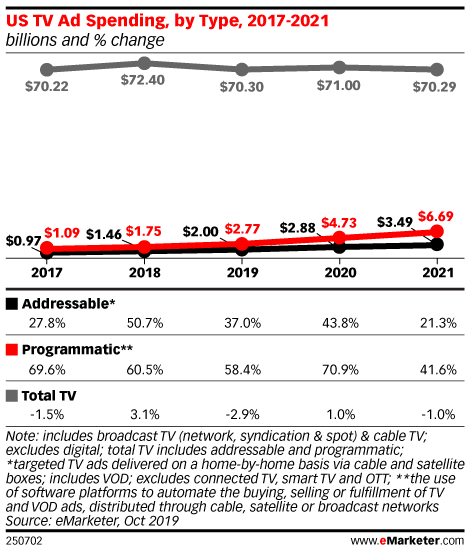 EMarketer in November estimated programmatic TV ad spending will reach $6.69 billion in the US by 2021, more than doubling from $2.77 billion.