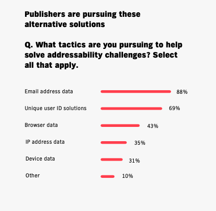 The solutions and data sources publishers are pursuing include email address data, unique user IDs, browser data, IP address data and device data. A majority of survey respondents cited email address data as the most widely used addressability solution.